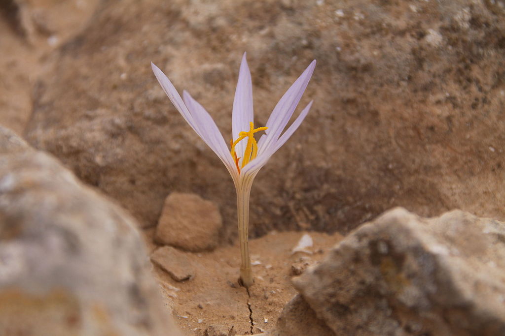 Original : A low plant with a corm. It keeps growing from year to year. There are 4-5 leaves and these are grey-green. They are 1-2 mm wide. The leaves are absent at flowering time. The flowers are white to deep lilac-blue. The throat is pale yellow and there can be purple veins on the outside. The flower styles are divided into many pale orange branches{{{0(+x).