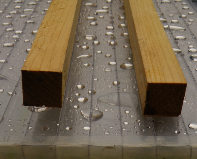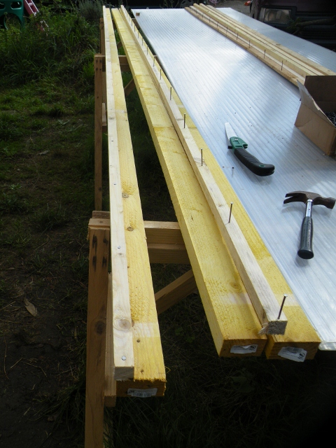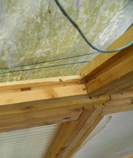 Astuce : Comme je me débrouille seul, j'ai trouvé une astuce pour installer les plaques de polycarbonate. J'accroche 1 (juste au milieu) à 3 demi-chevron(s) ou une latte(s) épaisse(s)